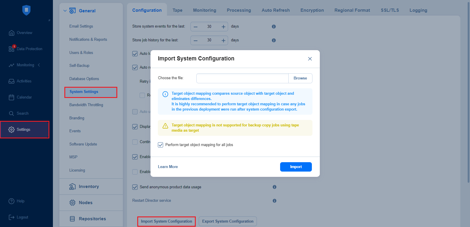 System configuration export and import are designed for migration purposes only, and not to serve as a system configuration backup. After you have exported system configuration from an old instance of the product, do not run jobs in that old instance. Doing so results in failed jobs in the new instance after the migration. All jobs have to be recreated, and full initial job run is required.