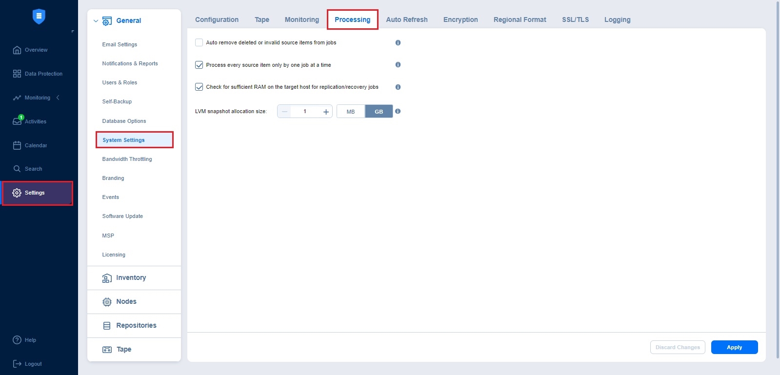 LVM snapshot allocation size: This option allows you to set an LVM allocation snapshot size for a Linux physical server backup. The default size is 1 GB. The maximum size is 1000 GB.