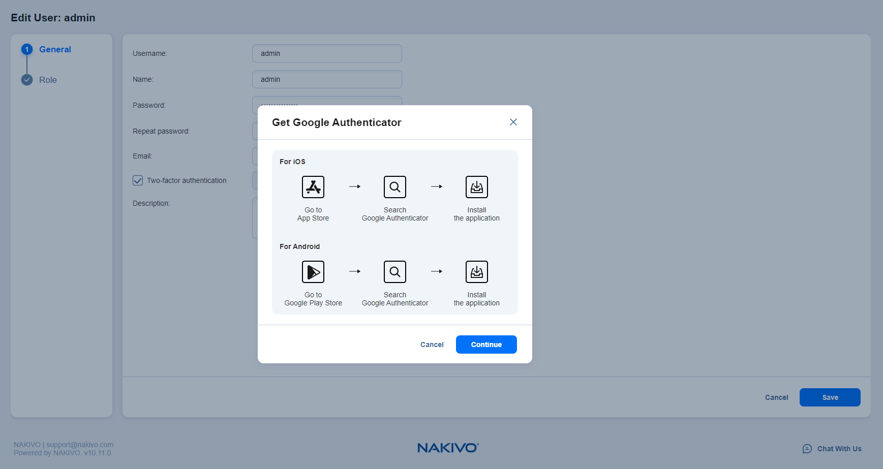 NAKIVO Backup & Replication uses Google Authenticator for two-factor authentication. To set up Google Authenticator, do the following: