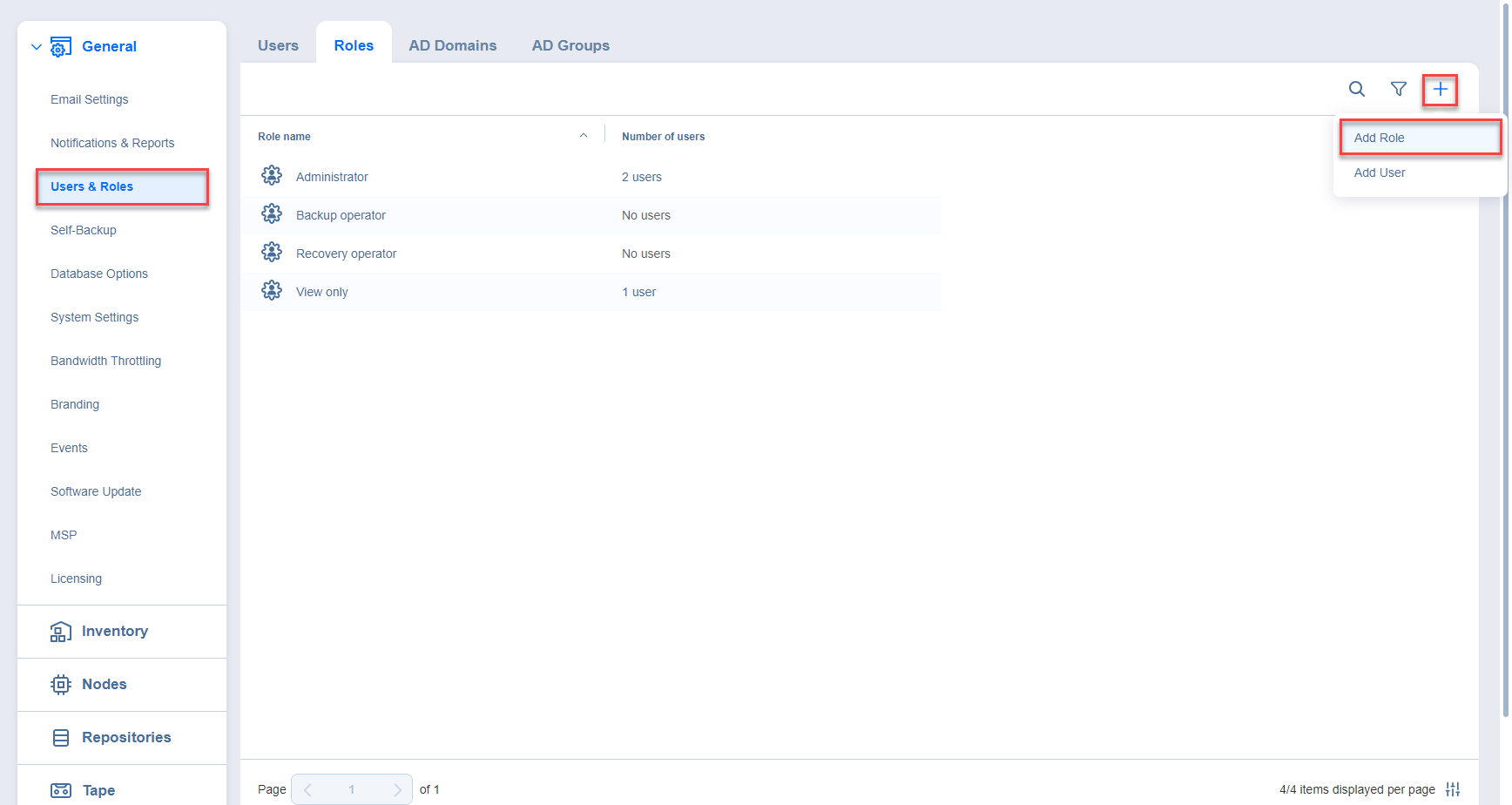 Accessing NAKIVO Backup & Replication is possible either with a user account created in the product or with an account added to the product from Active Directory. Each user in the product is assigned a role, which is a set of specific permissions.