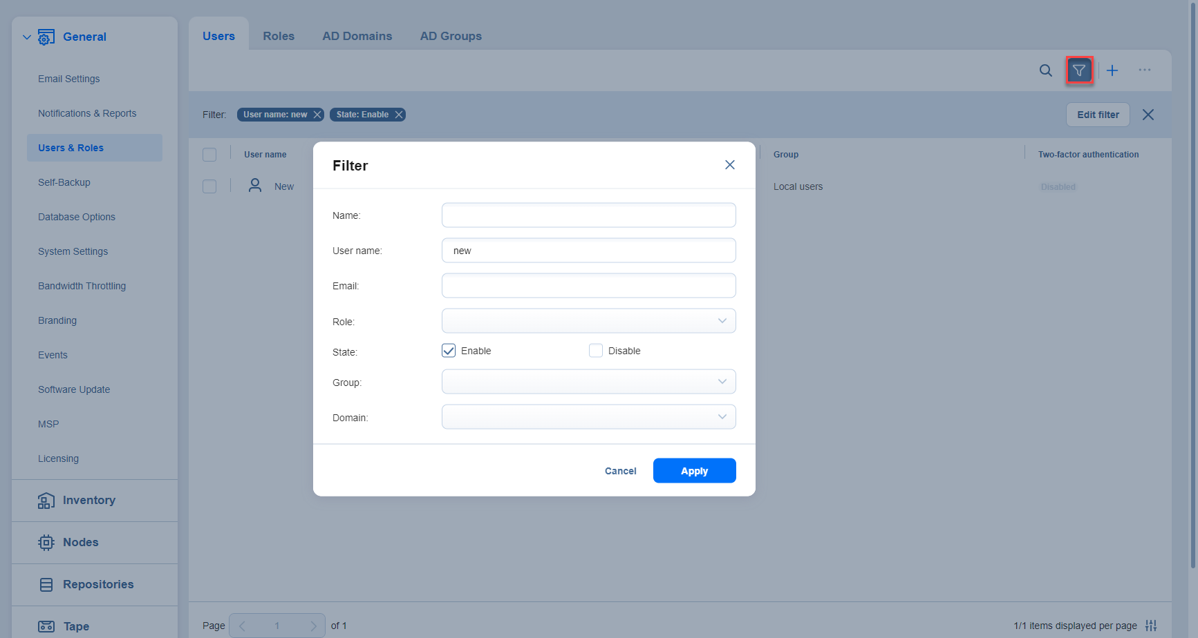 Clicking Filter opens a new window that allows you to filter the list of local users according to User name, Role, State, Group, and Domain.