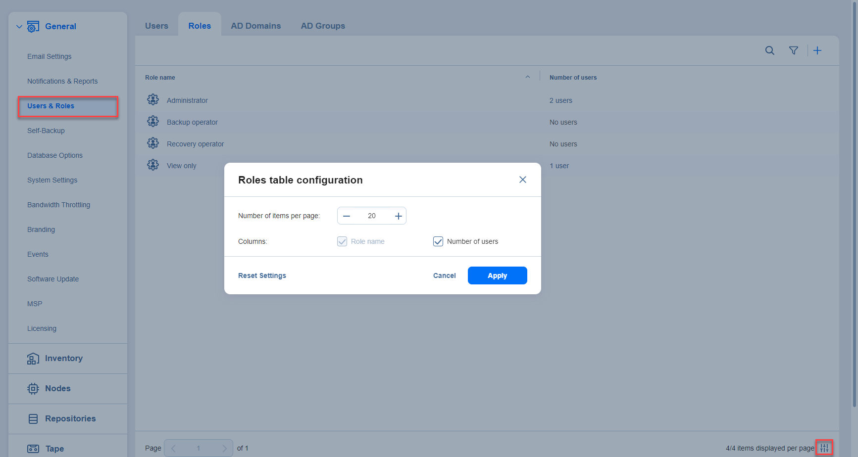 You can show/hide columns or modify the number of items per page in the Roles table. In the lower right corner, click the controls icon. In the dialog window that opens, select/deselect checkboxes and click Apply. The following options are available: