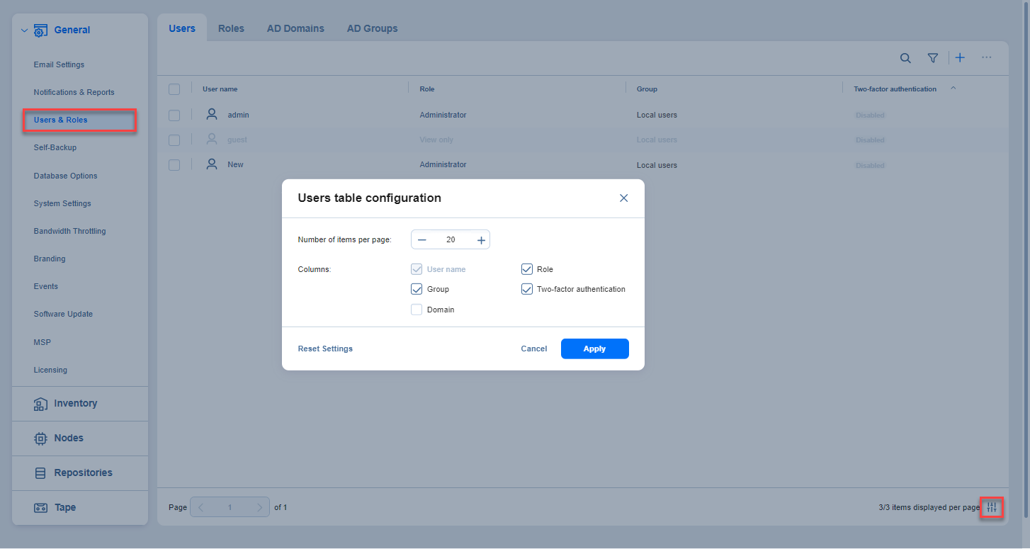 You can show/hide columns or modify the number of items per page in the Users table. In the lower right corner, click the controls icon. In the dialog window that opens, select/deselect checkboxes and click Apply. The following options are available: