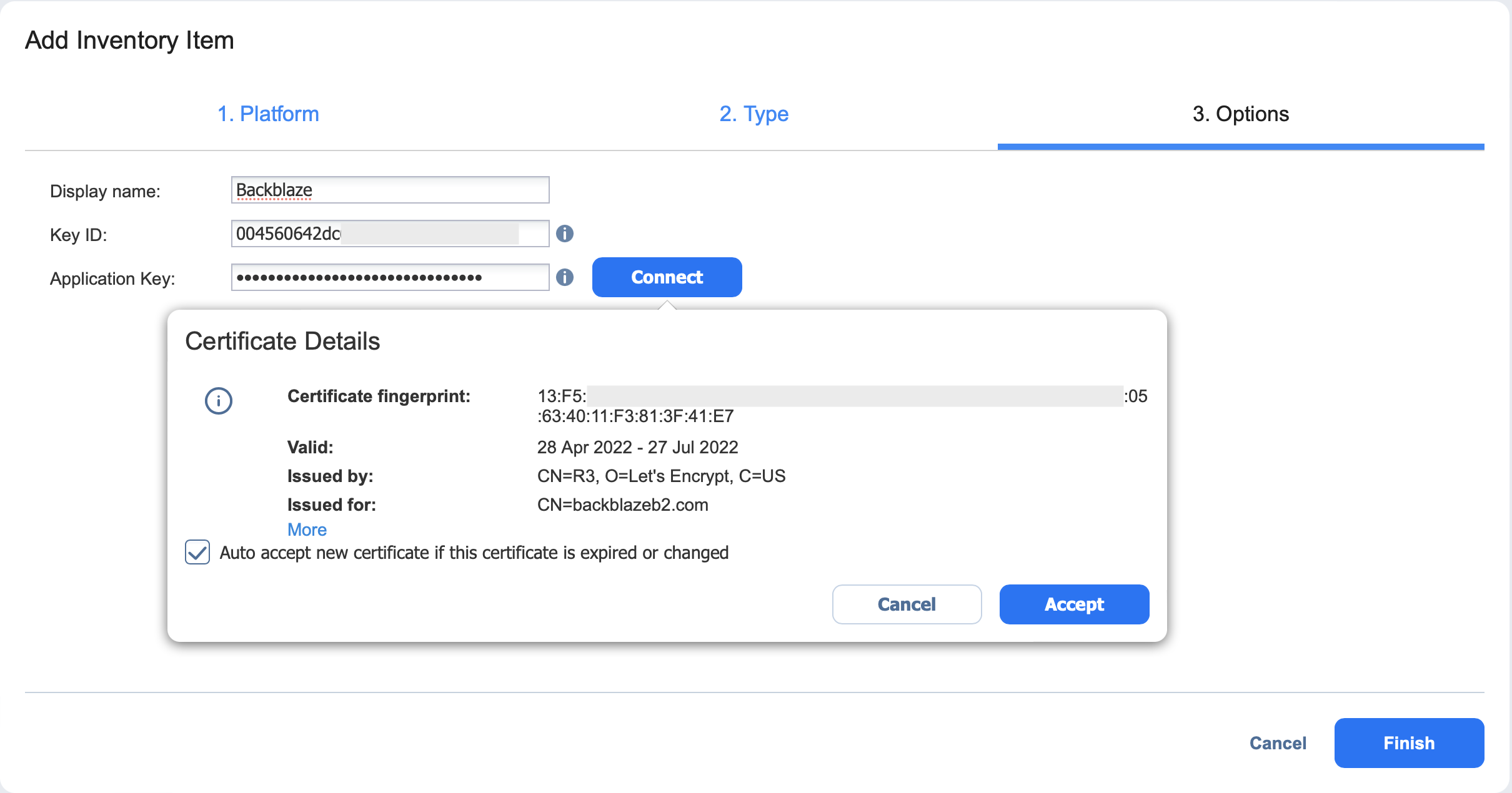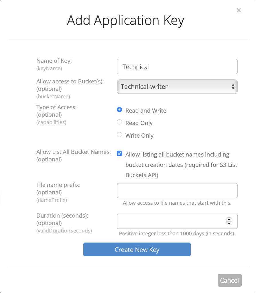 Application Key: Enter the Application Key generated on the App Keys page in your Backblaze account.