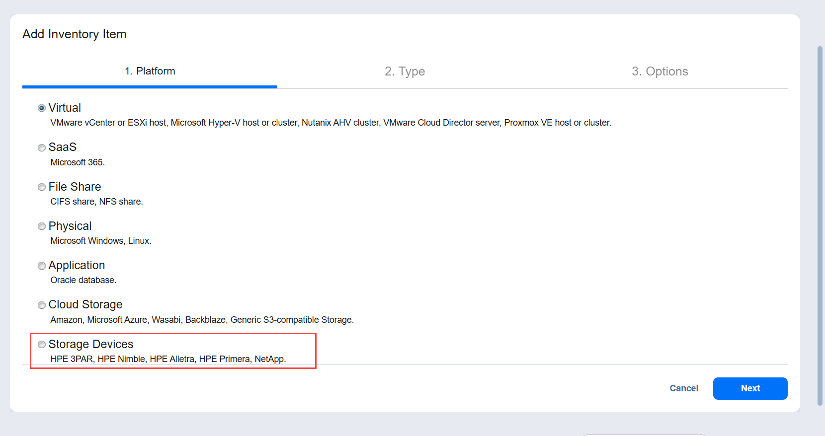 4. On the Platform page of the wizard, select Storage Devices and click Next to proceed.