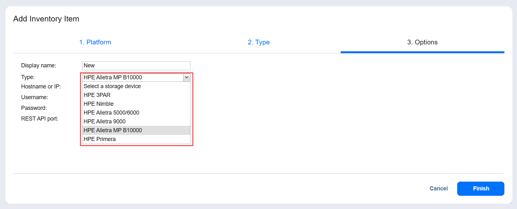 • Type: Select the storage device type from the dropdown list: HPE 3PAR.