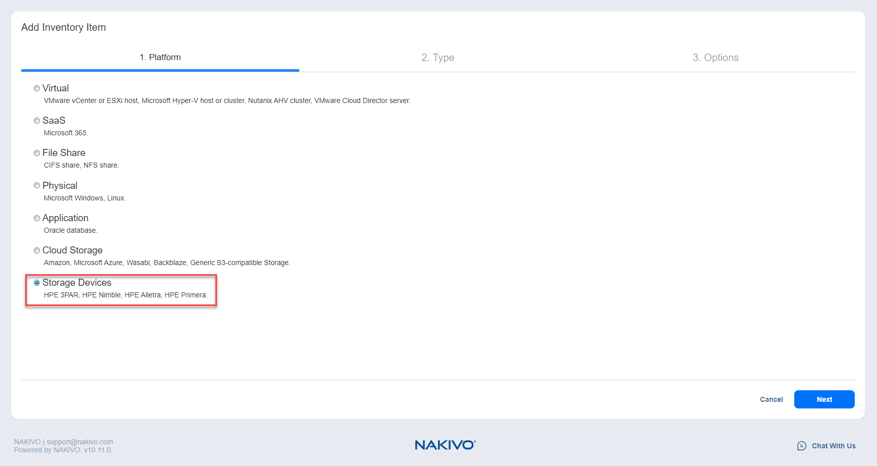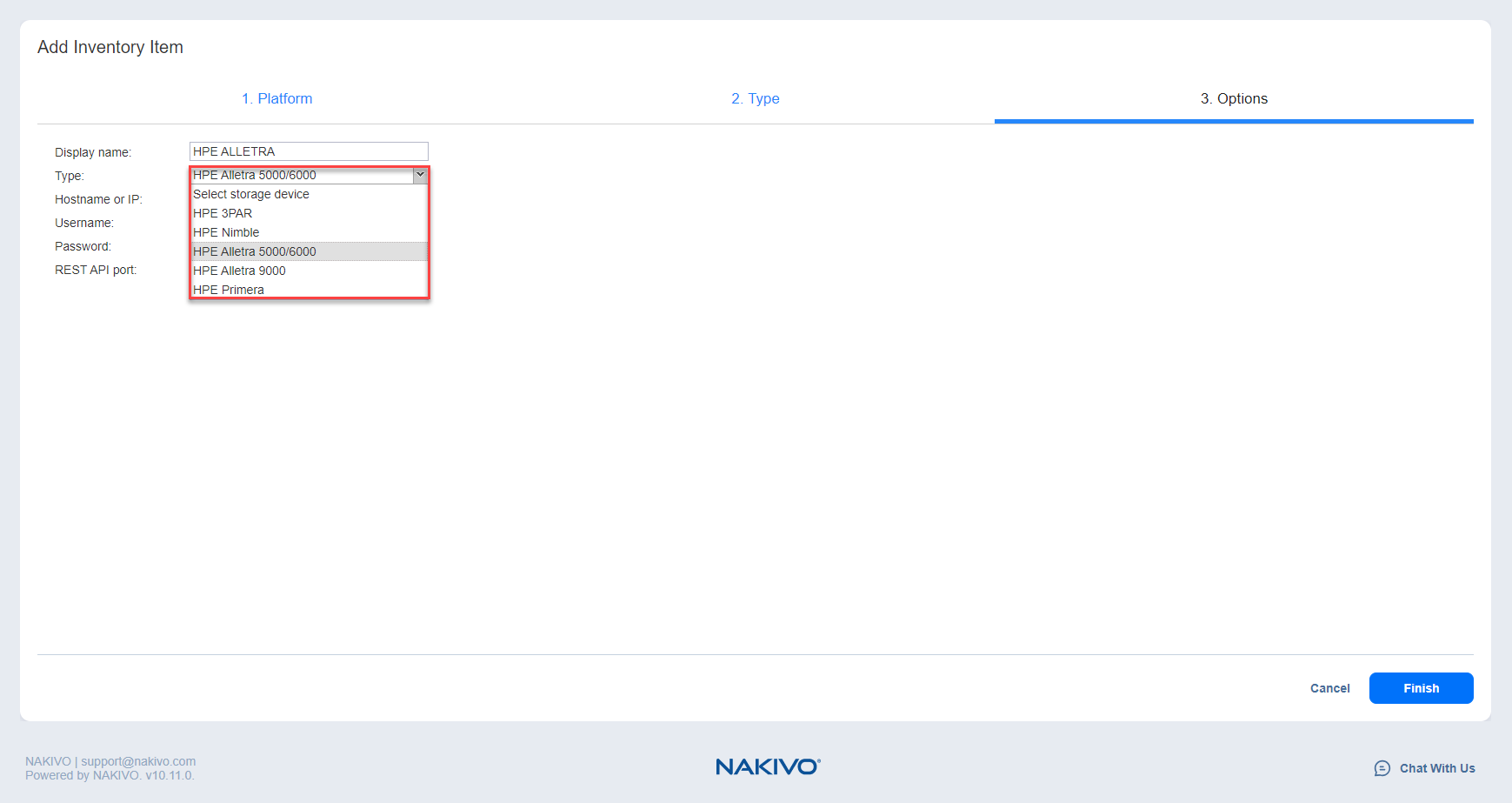 To add an HPE Alletra storage device to the NAKIVO Backup & Replication Inventory, follow the steps below: