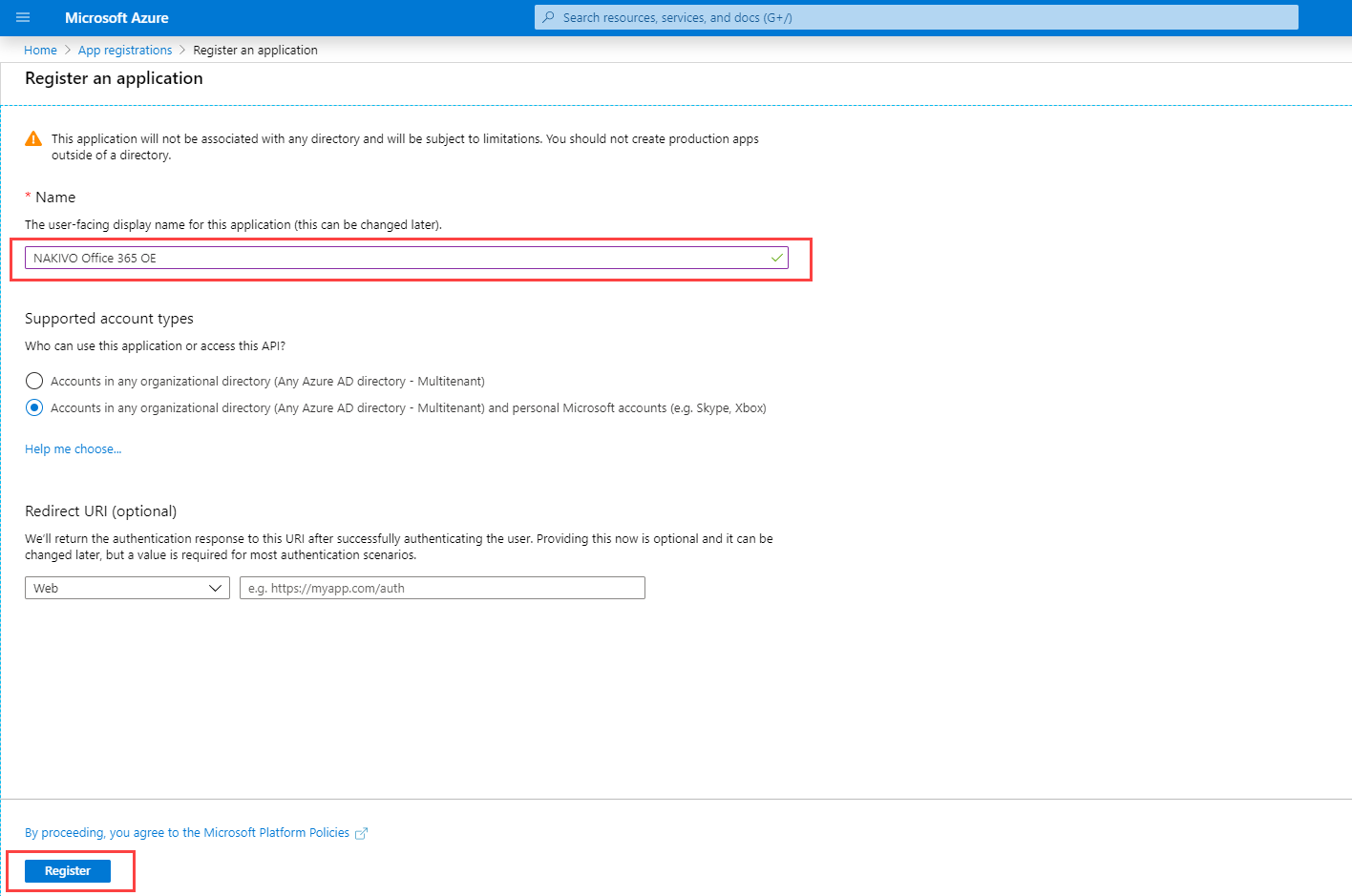 In order to add a Microsoft 365 account to NAKIVO Backup & Replication, the account has to be registered in Azure Active Directory.