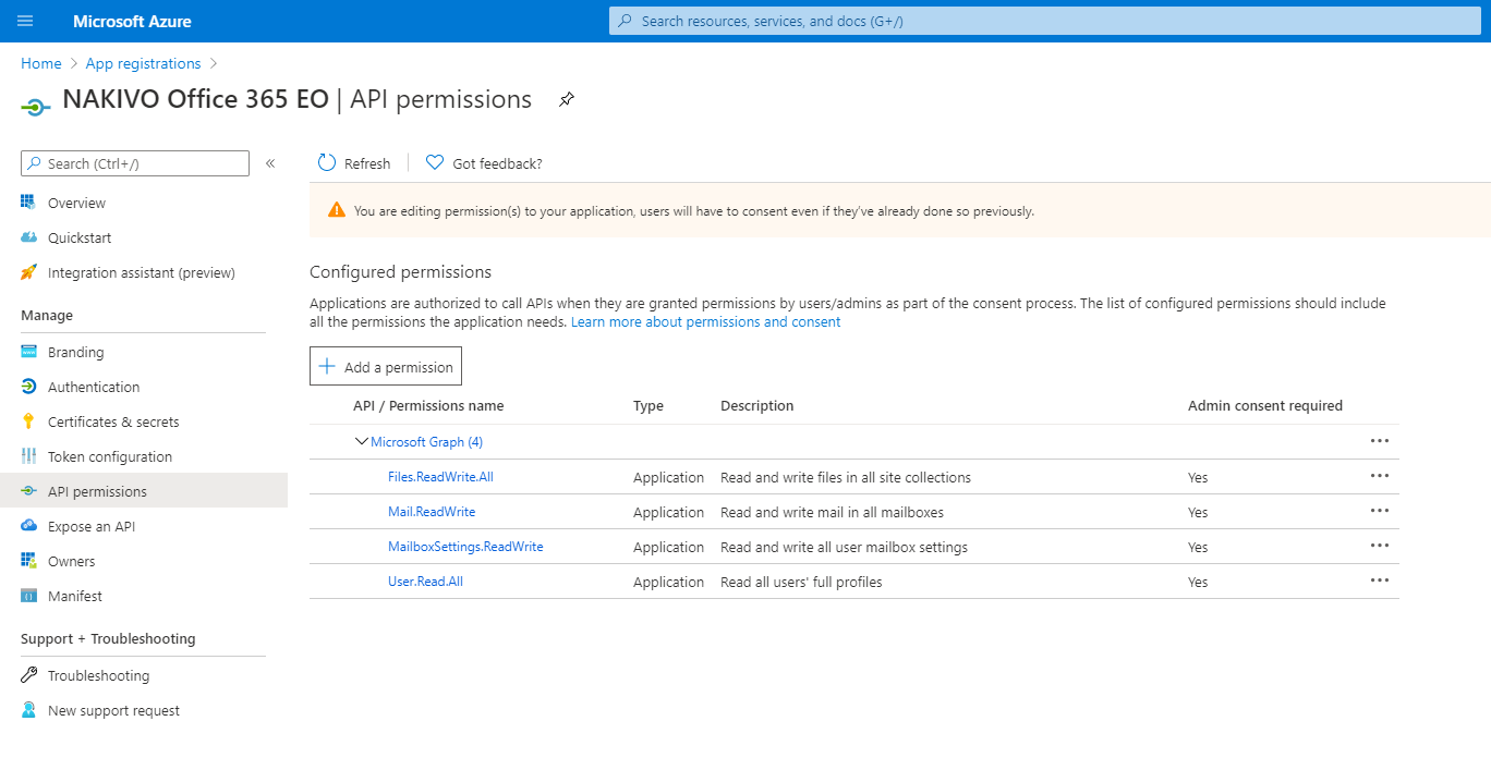 If the necessary Microsoft Exchange Online/OneDrive/Shaepoint API permissions are not provided, the corresponding service will not be discovered by NAKIVO Backup & Replication.