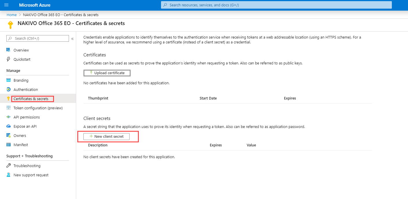 Click Certificates & secrets > New client secret to create a new client secret for your app.