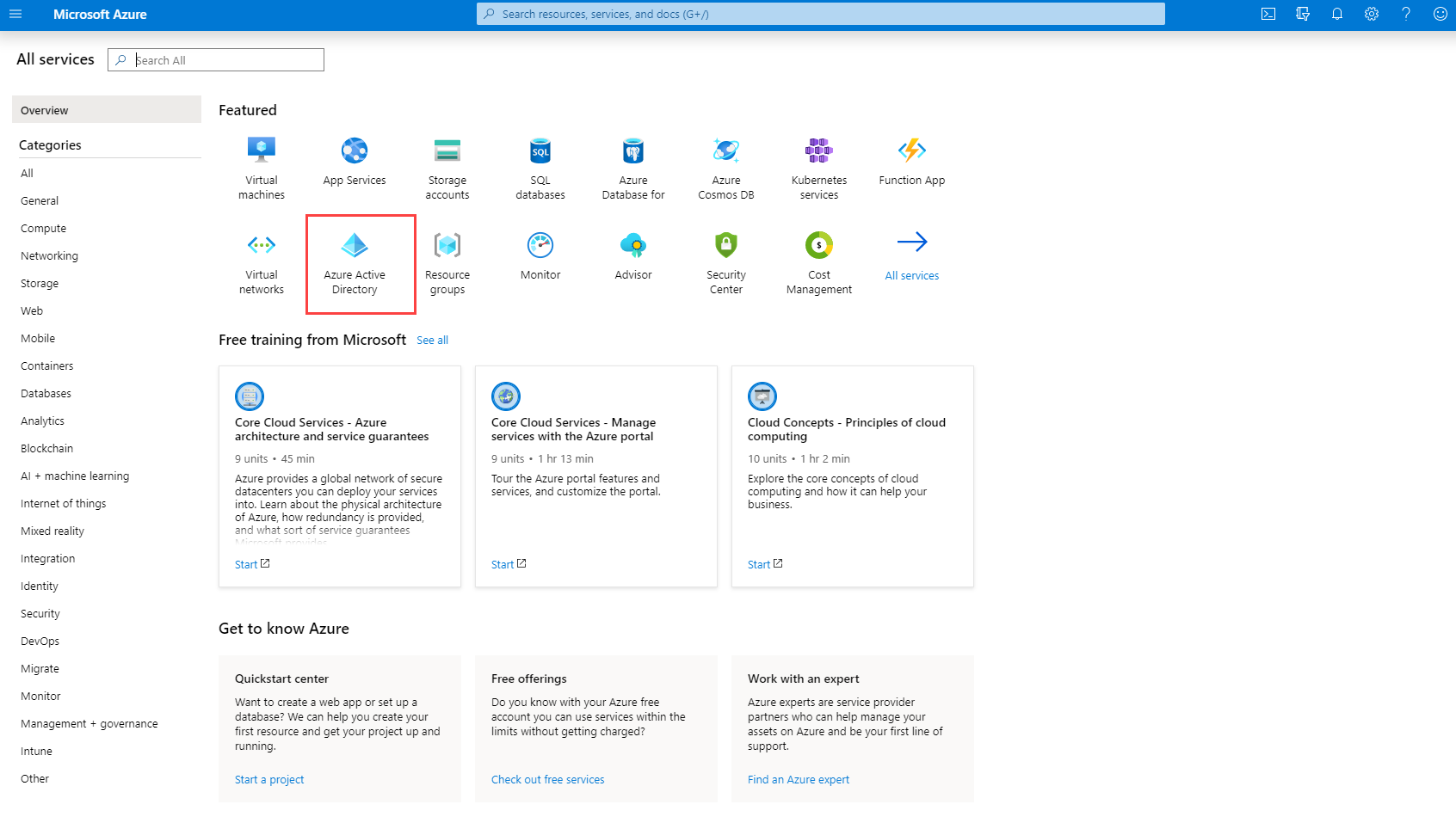 3. Select Azure Active Directory from the Dashboard or from the Portal Menu.