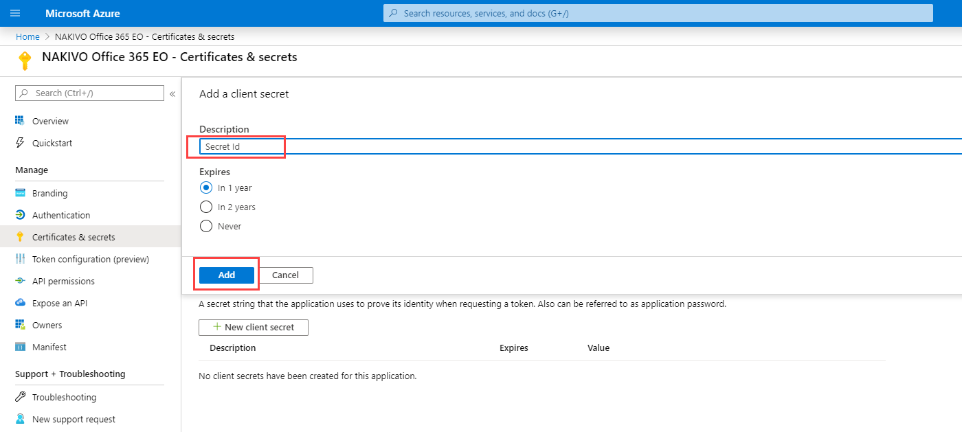 13. Enter a description for the client secret, select the expiration period, and click Add.
