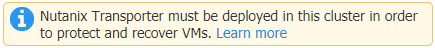 The Nutanix Transporter must be deployed in the cluster to enable backup/recovery operations. You will still be able to add the cluster to the Inventory, but Nutanix operations will be disabled in the menu until the Transporter is deployed. The system will notify you with a warning message if the Transporter is missing.