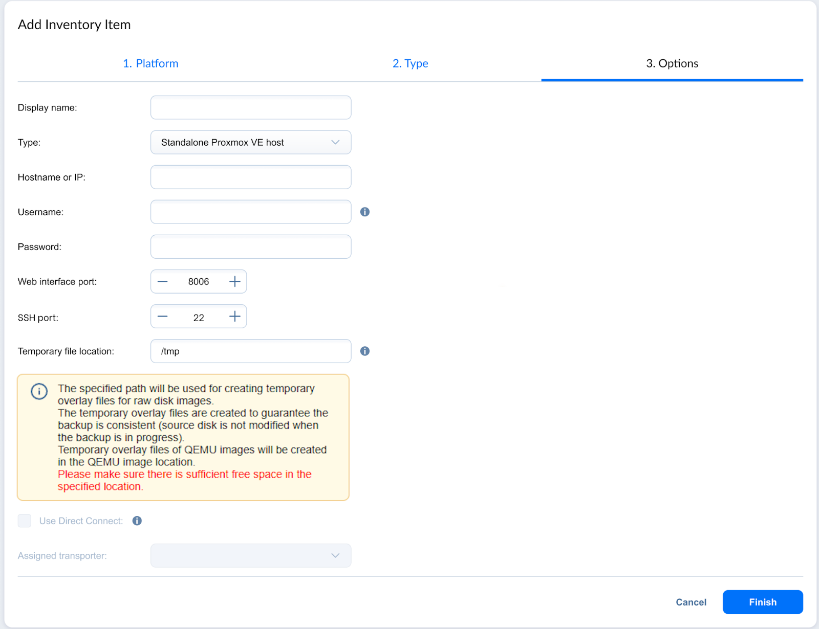 Use Direct Connect: Select this checkbox to route all communication with the Proxmox VE host or cluster through the Assigned Transporter using Direct Connect.