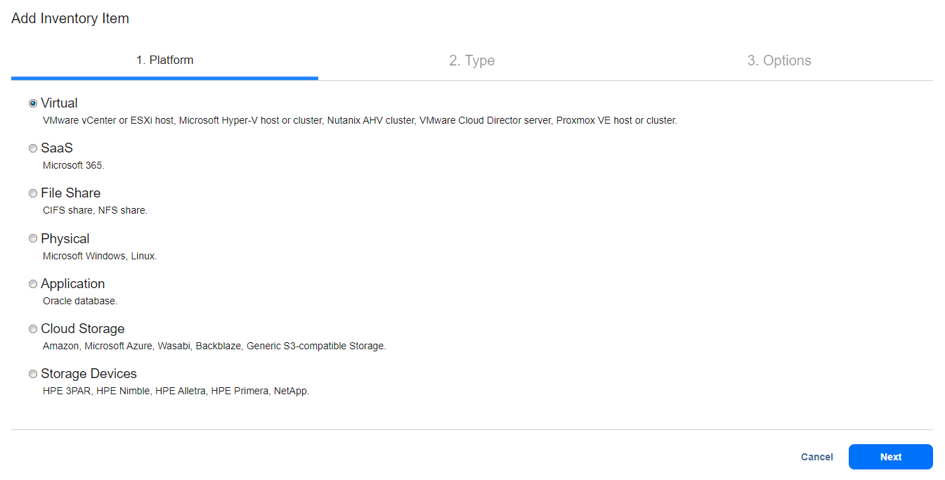 On the Platform page, select VMware vCenter or ESXi host, Microsoft Hyper-V host or cluster, Nutanix AHV cluster, VMware Cloud Director server, Proxmox VE host or cluster.