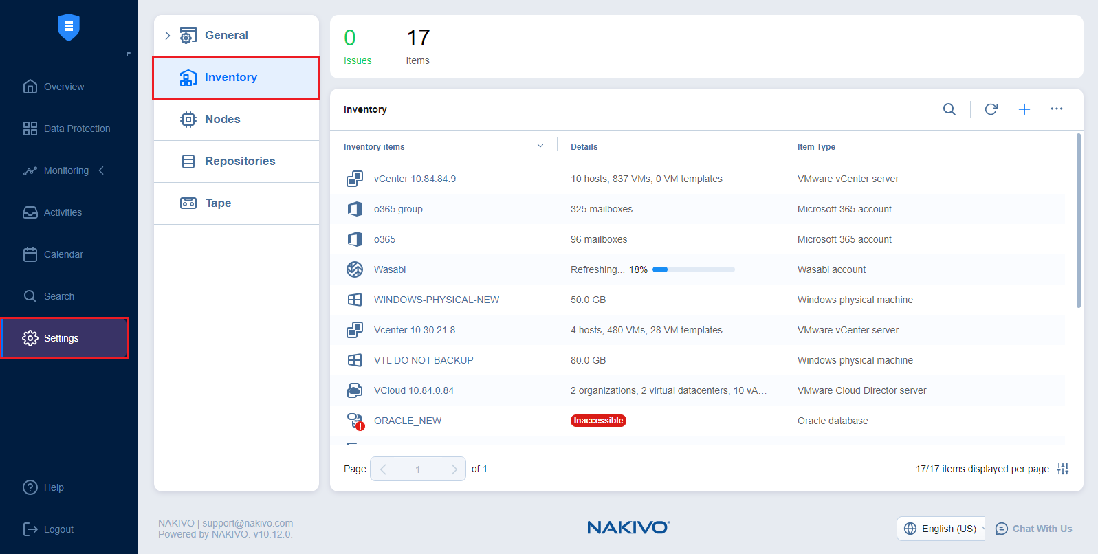 Prior to creating backup, replication, or recovery jobs, you need to add your virtual/cloud/physical infrastructure, Microsoft 365 account, Oracle database, or supported storage device to the product’s Inventory. The discovered item is added to the internal product database, which is refreshed every 1 hour by default. The Inventory tab contains a Summary bar, which offers an overview of all Inventory items. The data displayed is as follows: