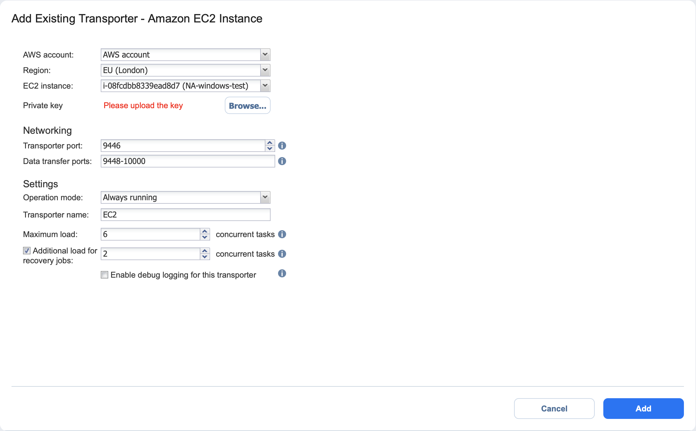 The Add Existing Transporter - Amazon EC2 Instance dialog opens. Fill out the fields as described below: