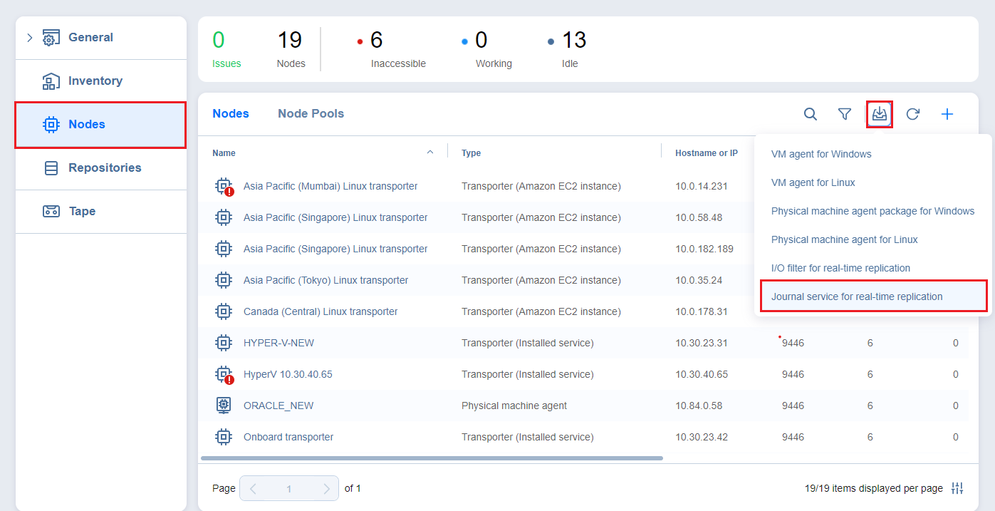 You can download the Journal Service installer from the NAKIVO Backup & Replication UI. To do this, go to Settings > Nodes, click the Download button, and then click Journal service for real-time replication.