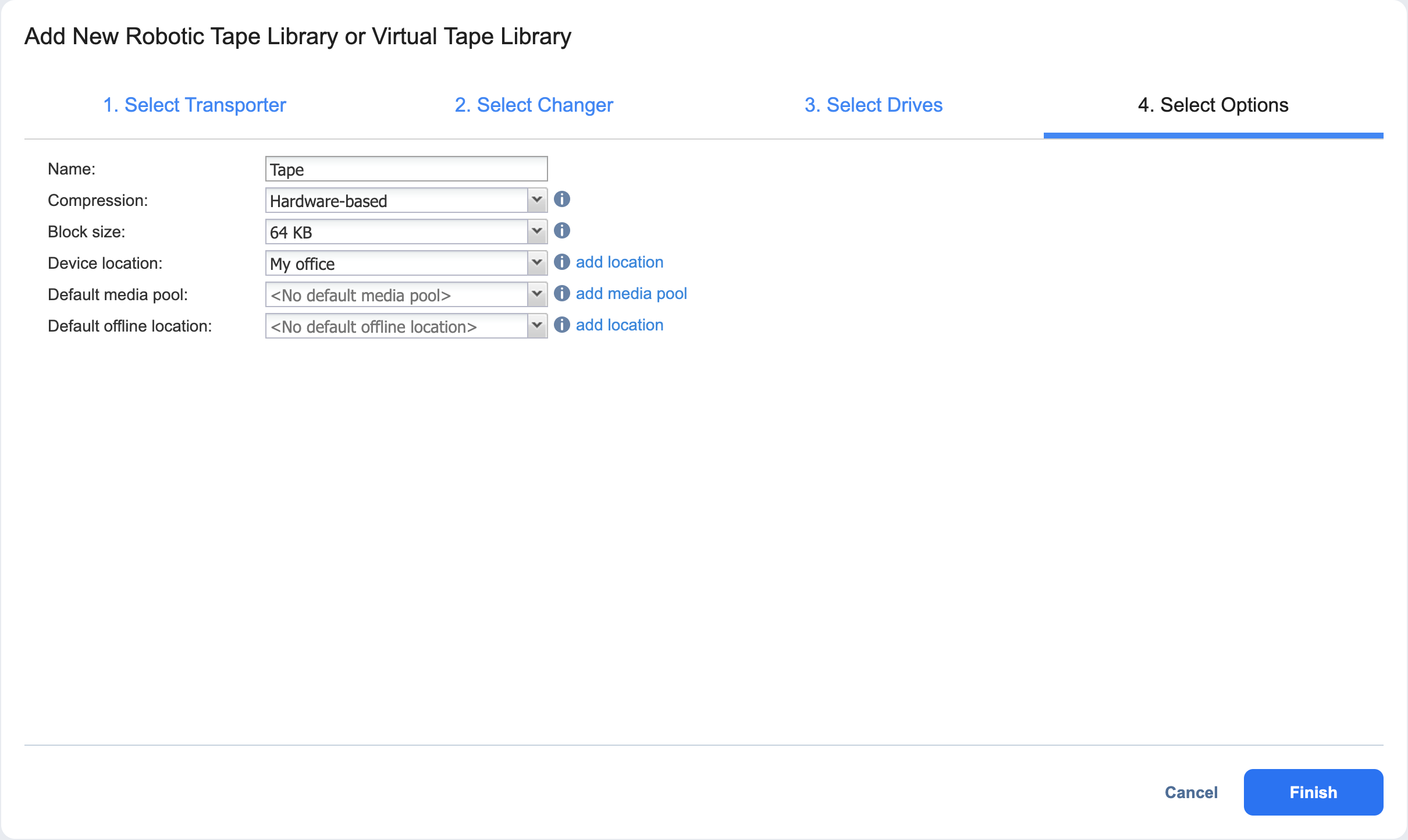 Device location: Select the location of the device and all tapes inserted into this device. The automatically created My office location is selected by default. To create another location, click Add Location. For more information on locations management, refer to Managing Locations.