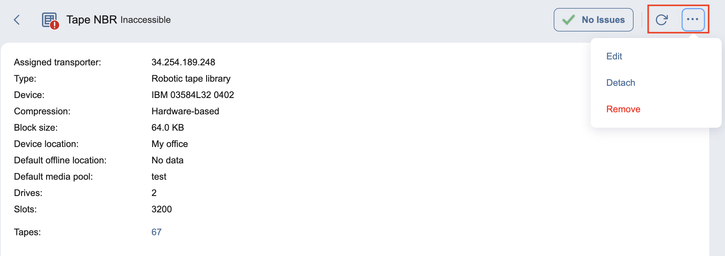 Detach/Attach: Allows performing manual tape library attach/detach. Tape cartridges contained in a detached tape device become offline.