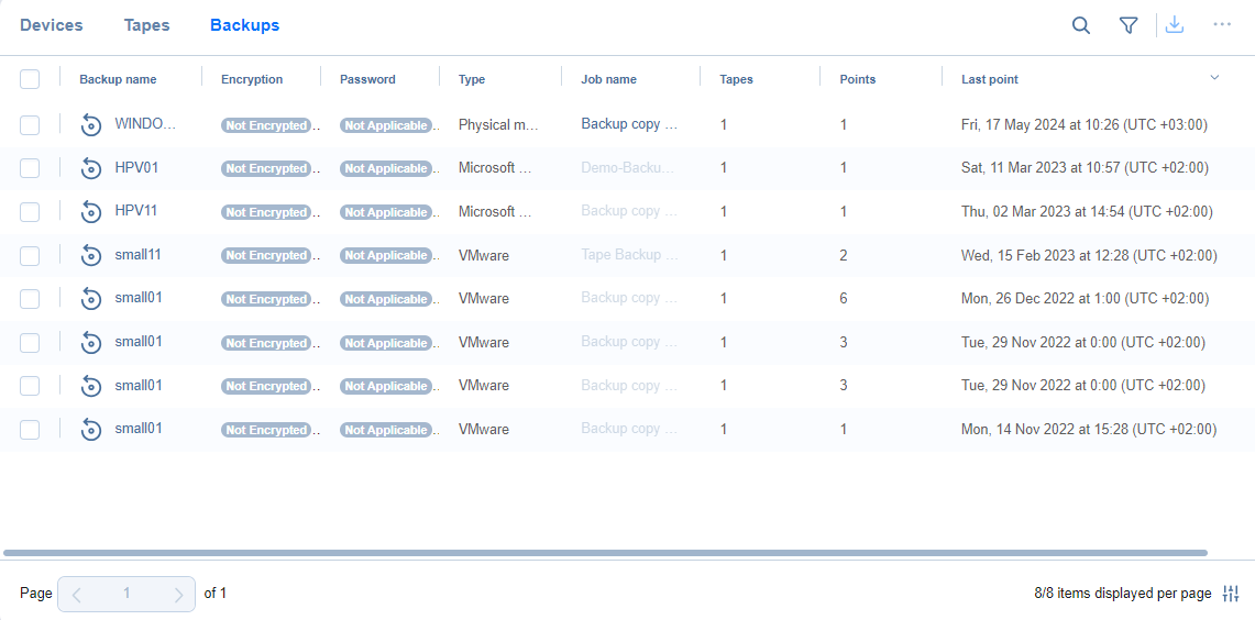 Clicking a tape backup name opens the Backup Details page where you can view the backup information and see all recovery points available for this backup. You can also initiate the recovery or password management process from here.