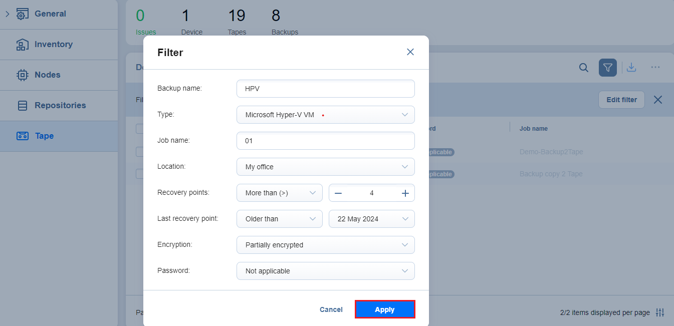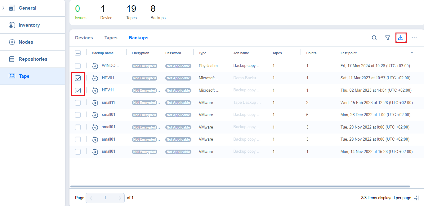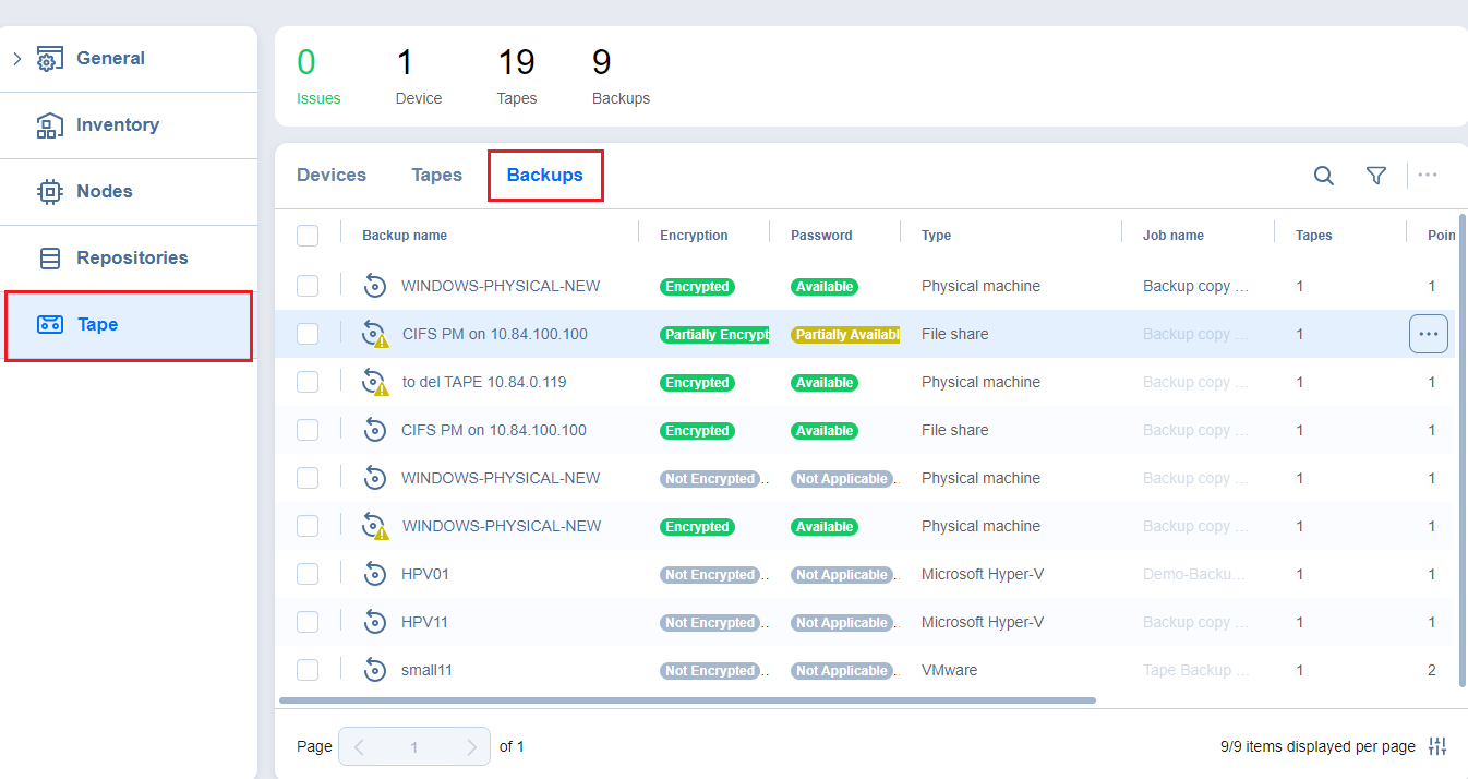 From the Tape tab, you can also manage all backups stored on tape cartridges by clicking the Backups tab.