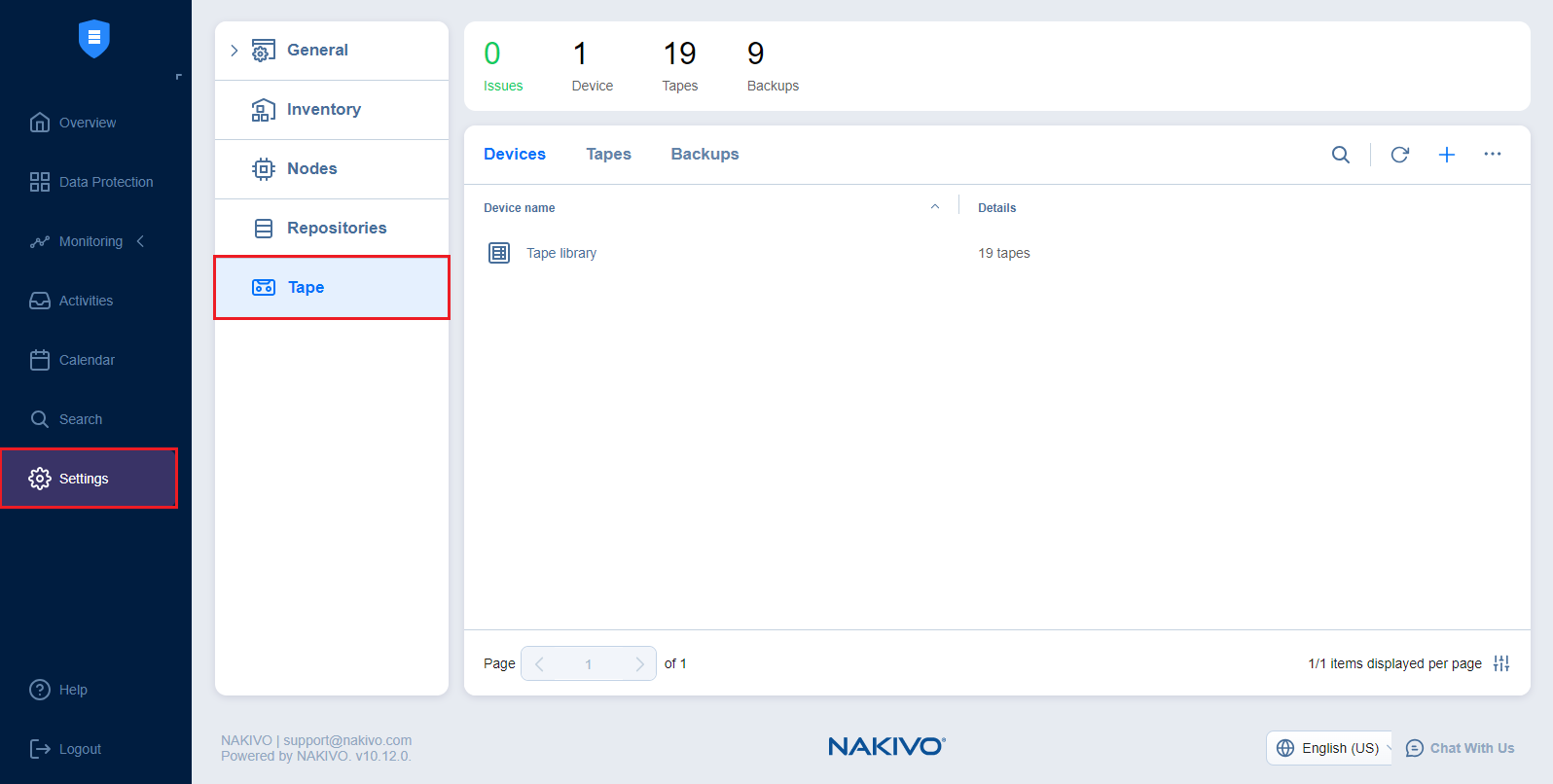 To start working with tape devices in NAKIVO Backup & Replication, you should first add and configure these devices on the Tape page of the Settings dashboard.