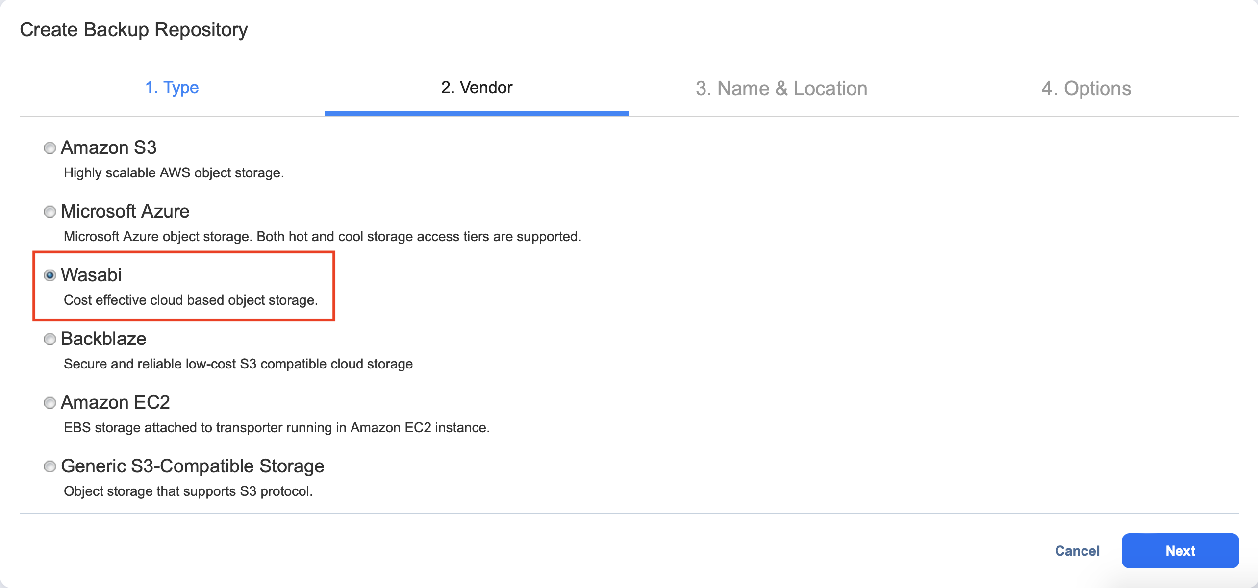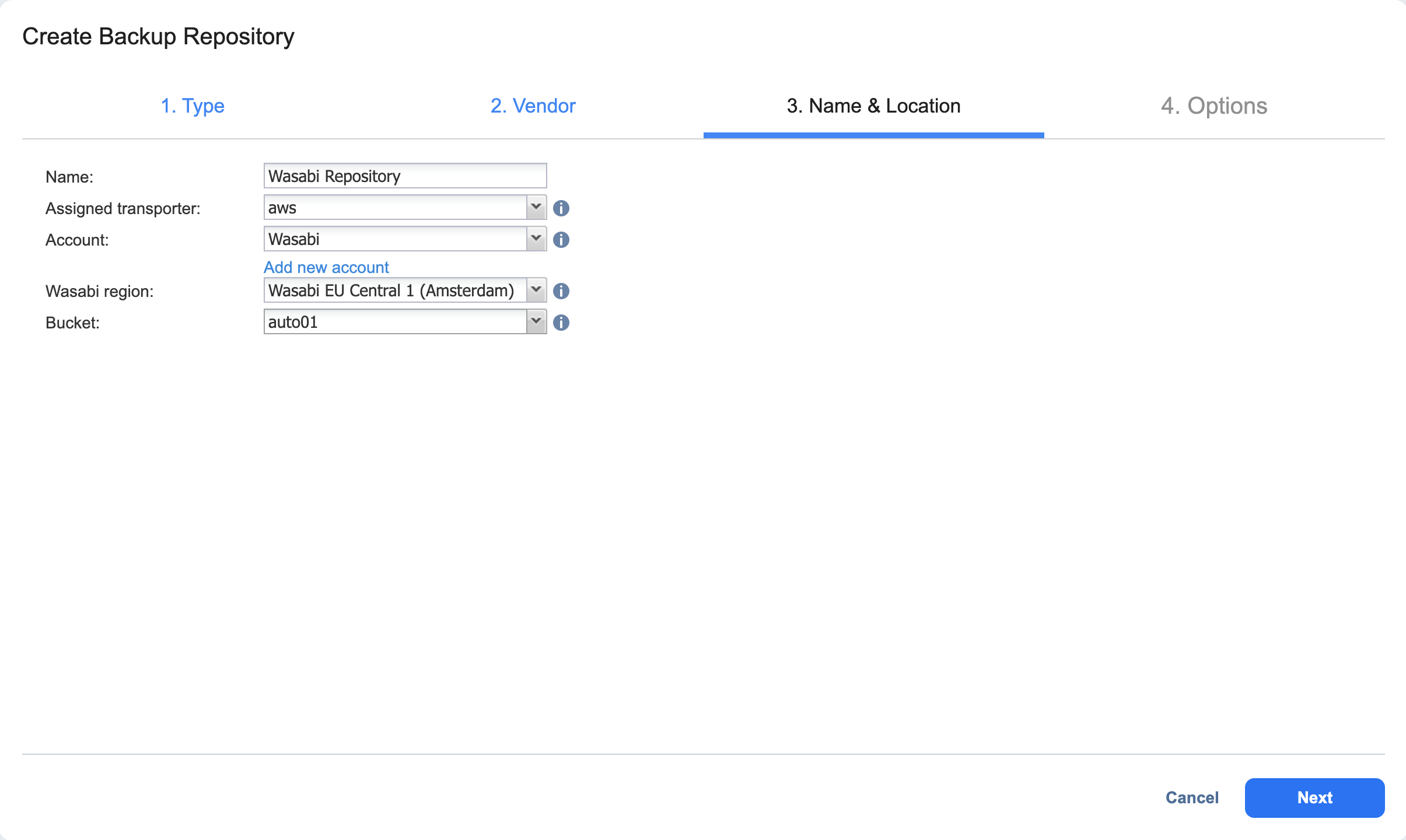 Para crear un Repositorio de backups en un cubo Wasabi, proceda como se describe en las siguientes secciones: