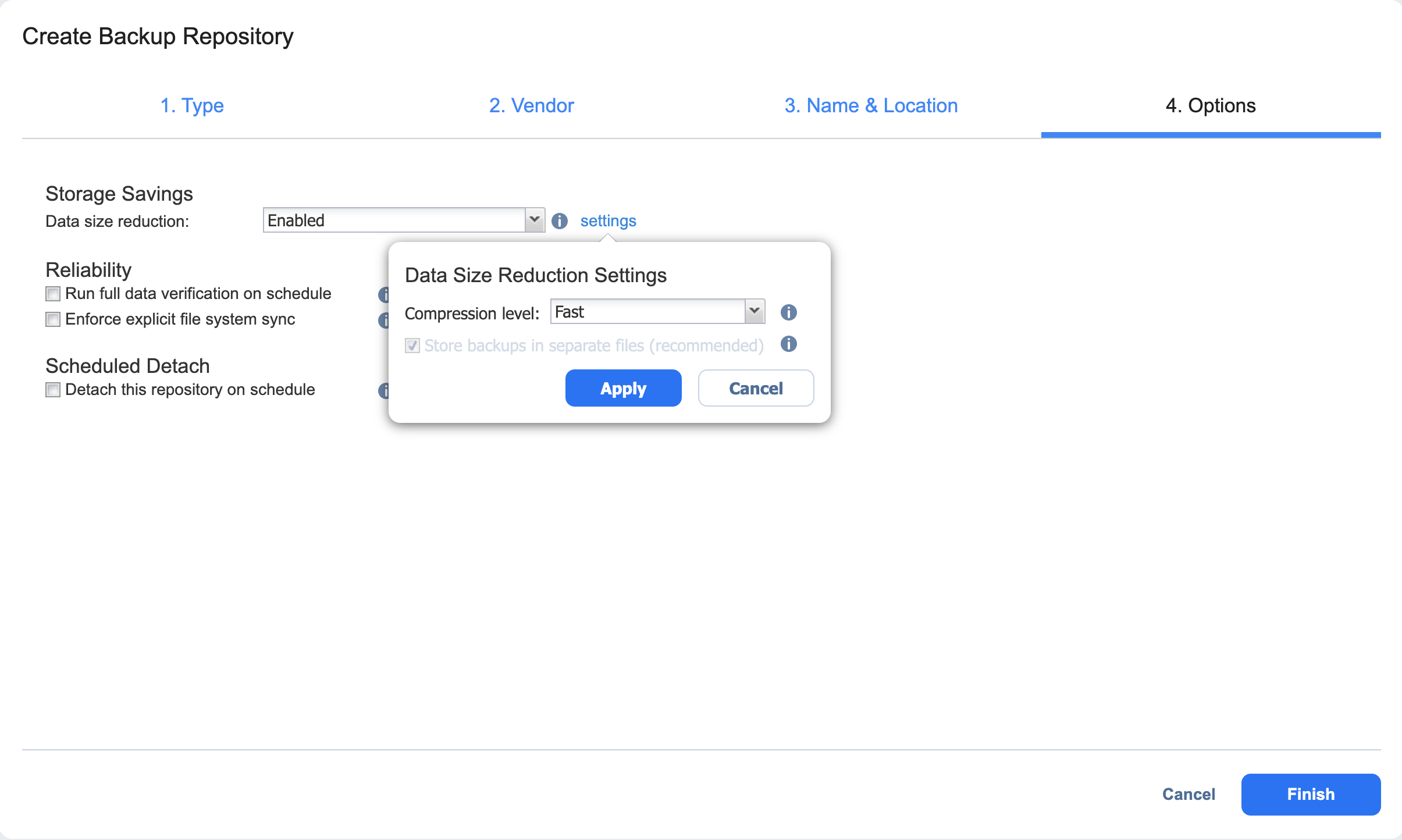 Haga clic en Finalizar para finalizar la creación del repositorio de backups.